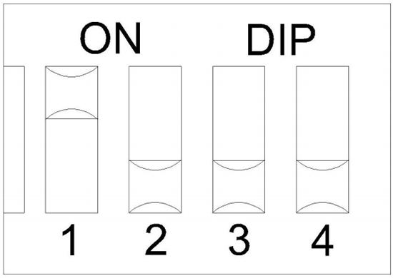 例如:二进制0001中最低位即个位数为1对应拨码开关中“1”的开关,十位数0对应拨码开关中“2”的开关,千位数0对应拨码开关中“3”的开关,万位数0对应拨码开关中“4”的开关,则拨码开关中“1”对应的开关应拨到“ON DIP”一头,拨码开关中的“2”“3”“4”对应的开关都拨到“1234”一头,二进制0001的拨法如下图: