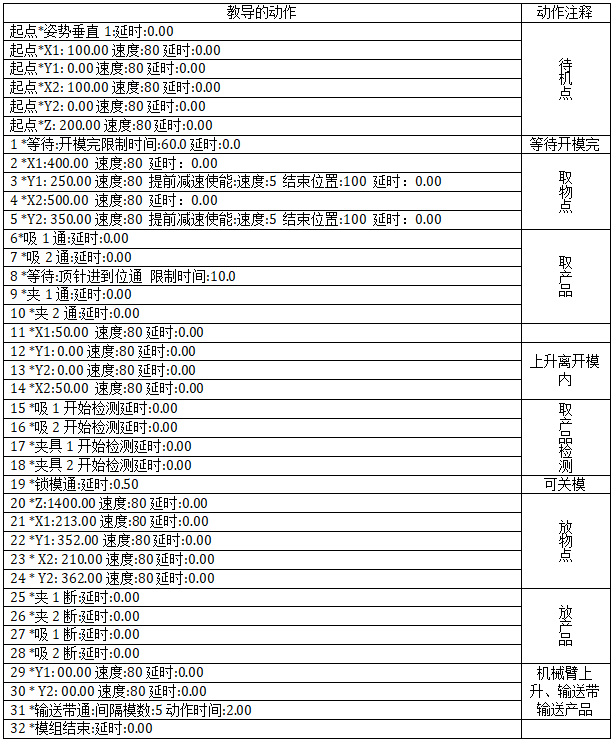 方框中的程序为驱控三轴型内取物,型外放物工作运行程序,使用的模号为默认的default,未修改任何默认机械设定。