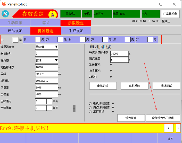 第一时间,工业机器人需要校准机械零位,先手动将机器人走到零位,对准刻度后,点击电机参数界面的全部设为原点。